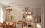 Обеденная зона состоит из большого овального стола и стульев с высокой спинкой. Классическую кухню украшает текстиль из натуральных тканей: шелка, льна, хлопка или ситца. Красиво смотрятся волнистые гардины в пол золотистого цвета, украшенные ламбрекенами или подвязками. В качестве источников света используют многоярусную хрустальную люстру, напольные лампы, бра и торшеры.