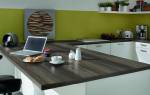 Ламинированная ДСП. Это один из самых экономичных и простых в уходе материалов. Для поддержания его внешнего вида достаточно протирать поверхность влажной тряпкой. Доступны различные формы. Однако стоит помнить о необходимости контролировать уровень влажности в помещении, особенно в осенний период, так как столешница может набухнуть и потерять привлекательный вид. Не рекомендуется ставить на стол из ДСП горячие предметы, такие как раскаленные сковородки, так как на поверхности могут остаться трудновыводимые следы.